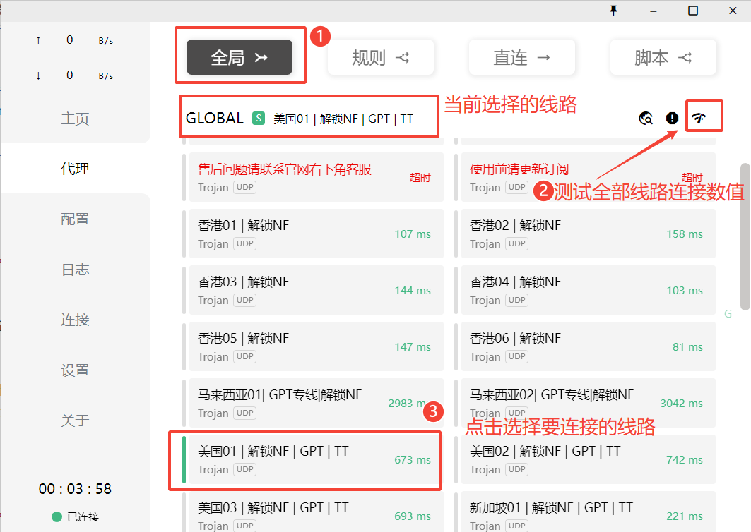## <font color="#DC143C">保存网址不迷路,请记住我们永久发布页</font> ### 🚩<font color="#DC143C">橘子官方发布页:</font>https://www.juzijiasu.cc ## ## ⭕️第一步:注册橘子加速账号,购买国外节点线路(已购买套餐看下面教程) ## ### 1、复制下面这个网址到浏览器中打开 <div class="mrdoc-fragment" data-fragid=4>[片段]橘子加速官方</div> ## 购买付费节点专享超高速网速 ## ### 2、注册登录 ##  ## ### 3、购买订阅-选择合适的套餐付款 ##  ## 第二步:下载Clash 导入付费节点 ## #### 1. 下载电脑Clash软件 ## >## 👉[点击下载PC电脑 Clash软件](https://app.juzijiasu.cc/ClashPC.zip)👈 ## ### 2. 下载到本地后,进行解压,打开解压文件夹,发送快捷方式到桌面,方便下次打开使用 (也可以不发送快捷方式到桌面,每次打开文件夹双击打开也可以!)  ## ### 3. 电脑桌面,双击打开clash软件程序运行  ## ## ## #### 4. 打开橘子加速网站首页 一键导入订阅 <div class="mrdoc-fragment" data-fragid=4>[片段]橘子加速官方</div> ##  ## #### 5. 下载后要选择订阅,注意选择后左侧会显示绿色 ##  ## #### 6. 点击代理,测试线路连接,选择线路 ##  ## ## #### 7. 点击主页,开启软件连接按钮  ## ## 能打开这个网址就代表已将成功加速了 ## https://www.youtube.com ## #### 网络节点售后问题 联系教程或者网站右下角客服 ### 橘子合作直达TG:https://t.me/daniuge09 ## ##